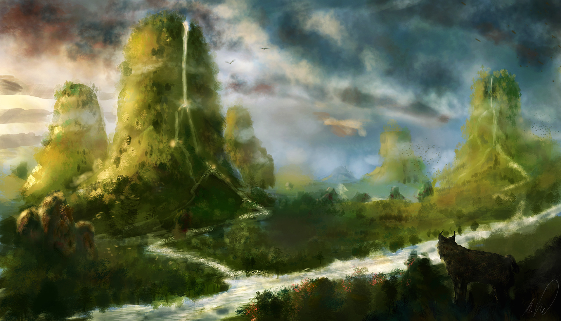 This landscape concept was requested for an adventure game. The goal was to create an first impression how a open jungle area with high mountians can look like.
